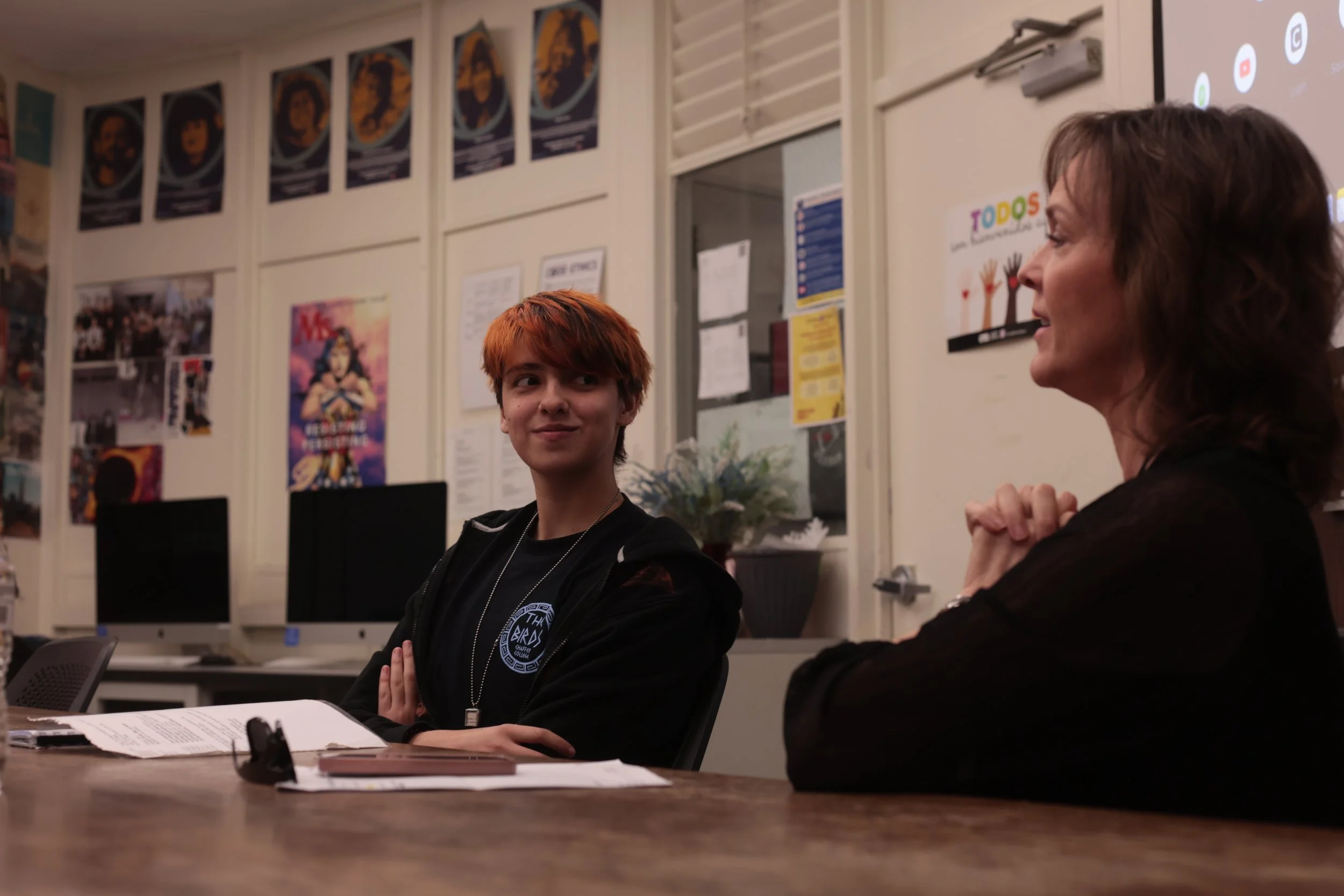 Image courtesy of Calvin Lee: Havenhill and Kolb sit in The Breeze newsroom, discussing Chaffey’s upcoming production.
