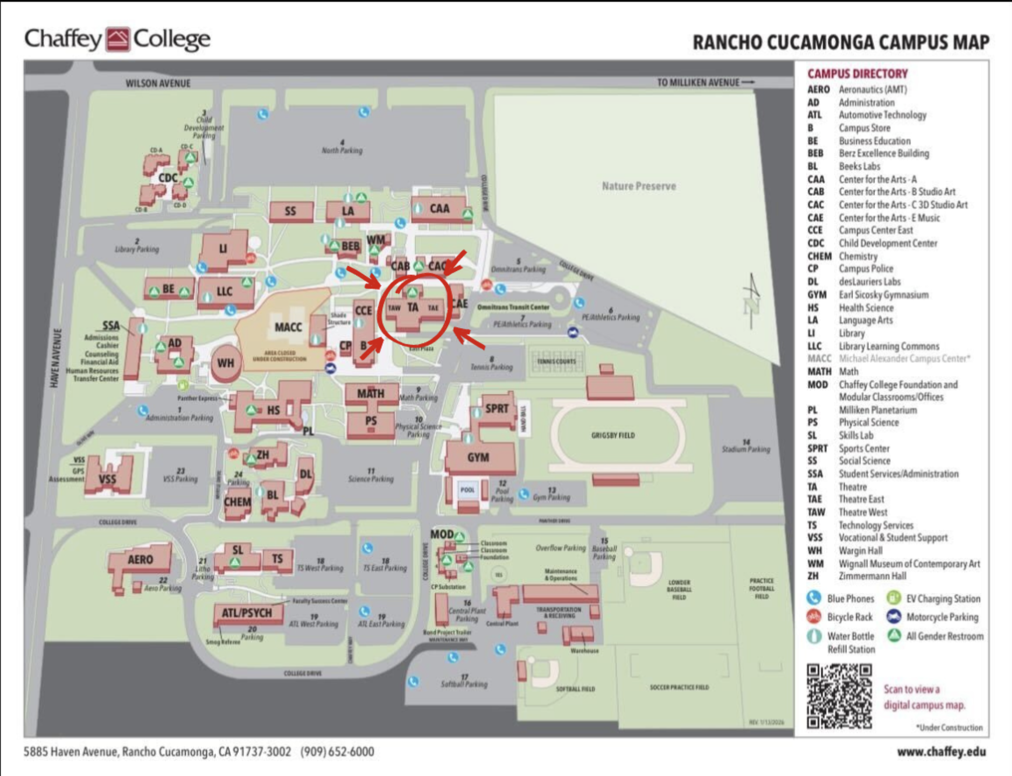 The Rancho Campus Theatre is located at TA on the north side of campus, west of College Drive.