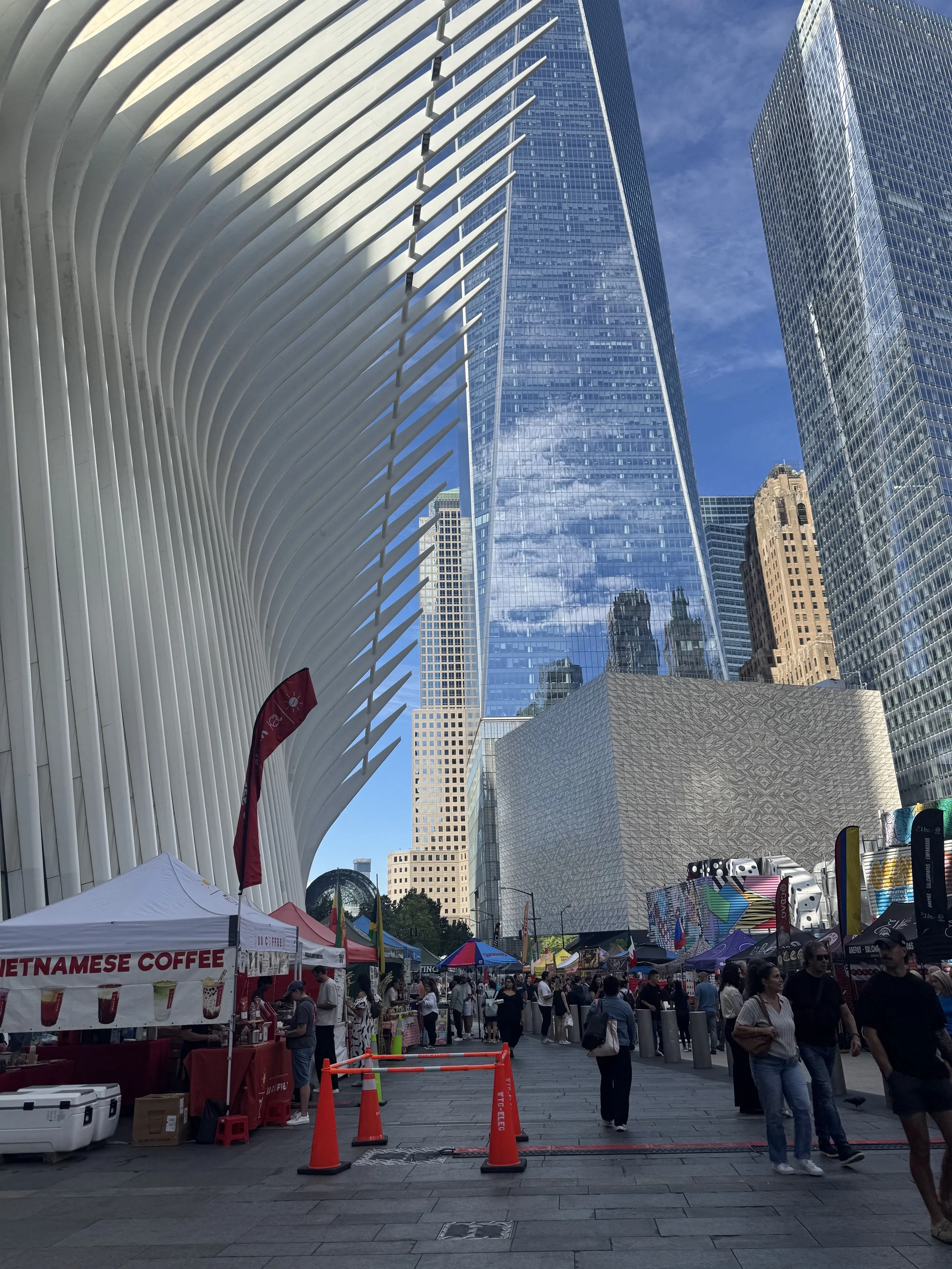 Bagels now tucked away safely in our bellies, we make our way down to the underside of the Brooklyn Bridge. Here, we catch a closer view of the Manhattan skyline before making our way back to the subway to take another 10-minute ride to the World Trade Center. There, we find rows of EZups and various aromatics to greet us as we approached the Oculus.
