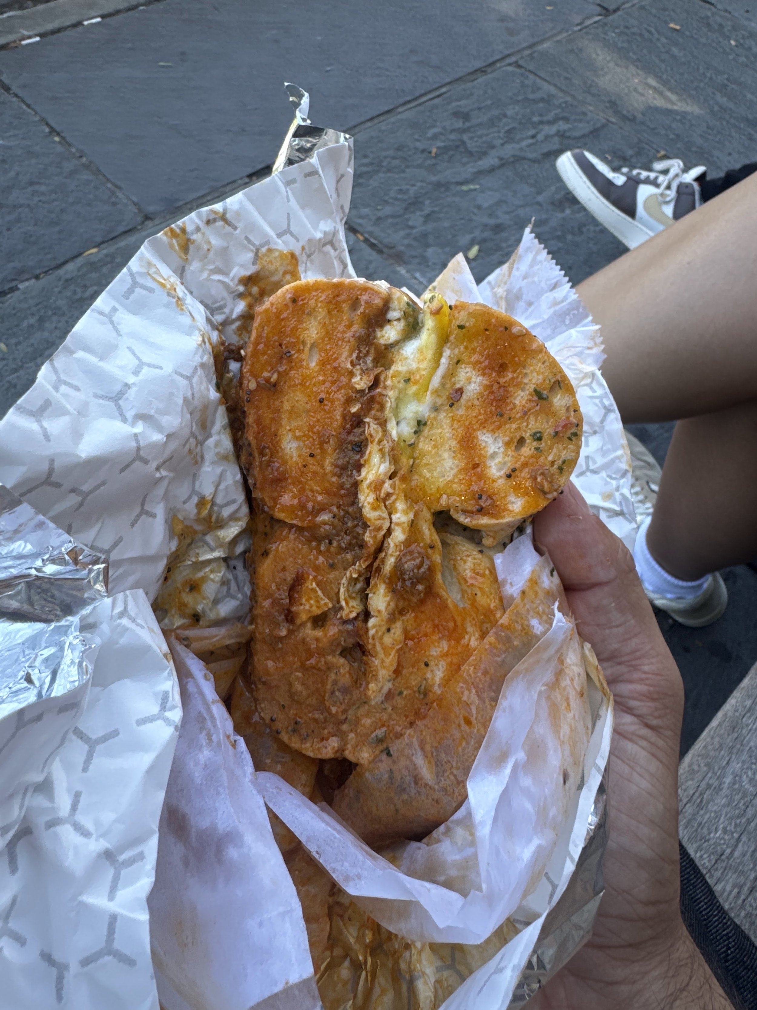 Another short train ride and our sleepy food-tour found seating at the Brooklyn Heights Promenade, and I dug into the most divine bagel I have ever been blessed with. My everything bagel was the perfect platform for the saucy and gooey mess made by the shakshuka. My bagel was not the only one that made its mark either. Along with their Korean Hangover bagel's gochujang and kimchi, Miss Bagel Brooklyn proved to be a delectable fusion that felt perfect for our first meal in New York.
